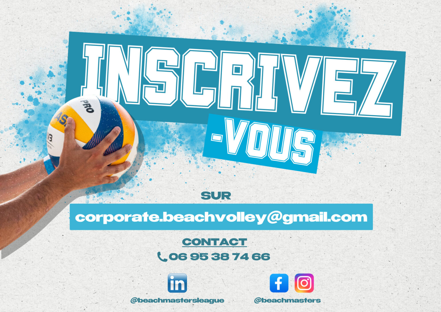 corporate.beachvolley@gmail.com Les offres Offre PARTICIPATION40€ TTC / personne 1 inscription au tournoi 1 welcome bag1 repas au bord des terrainsPhotos exclusives du tournoi Offre PREMIUM65€ TTC / personne 1 tee-shirt personnalisé3 boissons offertes1 inscription au tournoi1 welcome bag1 repas au bord des terrainsPhotos exclusives du tournoi Offre ACCOMPAGNATEUR 15€ TTC / personne 1 repas au bord des terrains1 boisson offerte